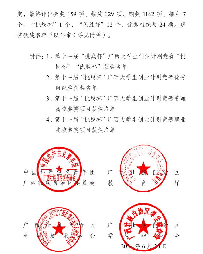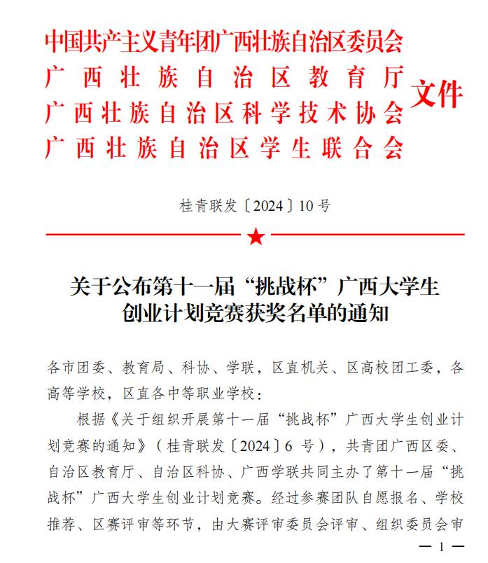 近日,由共青团广西区委、自治区教育厅、自治区科协、广西学联共同主办的第十一届“挑战杯”广西大学生创业计划竞赛获奖名单公布。彩神Vll报送的25个项作品中有22项获奖✹,其中金奖3项,银奖2项👱🏻♂️,铜奖17项🪄🤚。